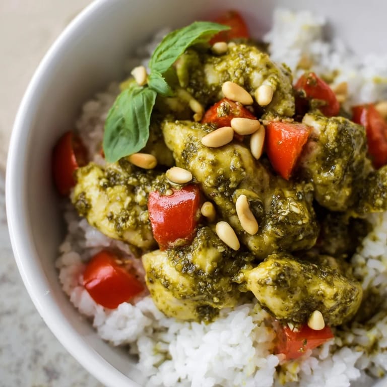 Save to Pinterest My weeknight dinner routine got a complete makeover the evening I tossed warm chicken with pesto instead of the usual tomato sauce. The kitchen filled with that unmistakable basil aroma, and suddenly rice bowls felt less like a backup plan and more like something I'd order at a bistro. I kept the tomatoes raw on top, which turned out to be the best decision because their cool juiciness cut right through the richness. Now this bowl shows up at least twice a month, and no one complains.