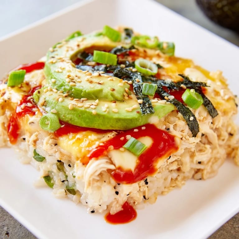 The genius of this dish is in how each layer adds something different. The rice is your base, warm and slightly tangy. The chicken mixture brings creaminess and a hint of spice. The cheese on top melts into salty, savory richness. And then those final toppings—the fresh avocado, the crispy nori, the sesame—they add texture and remind you that this is sushi-inspired, not trying to be something it's not. It's like building a flavor story, where every element has a job.