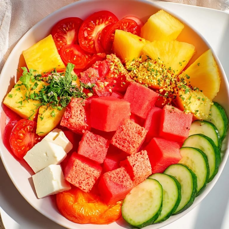 The genius of this dish is that you experience three completely different flavor arcs in a single gathering. When you build your own bite—grabbing a piece from each ring—your palate travels from the crispy, smoky heat of the chickpeas to the cool, herbaceous freshness of the cucumber and feta, then finishes with the bright sweetness of pineapple and watermelon. It's like a journey around the world in one plate, and everyone interprets it differently. I've watched people start with the spicy ring, others head straight for the fruit, and some build the perfect balanced bite from the beginning. There's no wrong way to eat this, which is part of its charm.