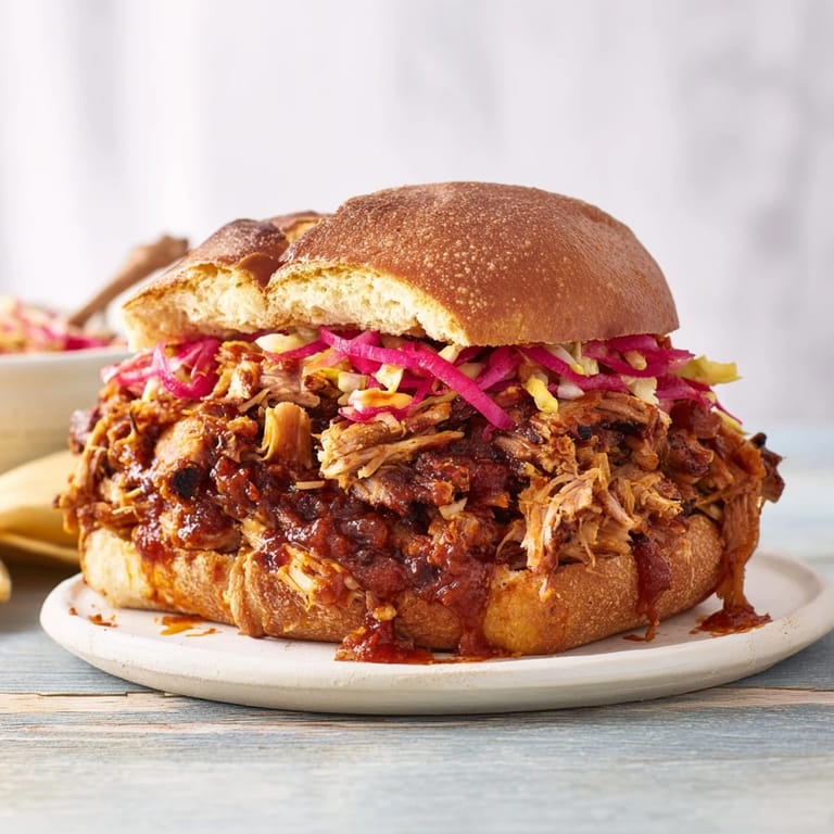 Save to Pinterest Succulent pulled pork slow-cooked and finished over open flame, tossed in smoky BBQ sauce, and piled high on toasted buns. Perfect for a hearty, rustic dinner with vibrant herb notes and a touch of fire-charred flavor.