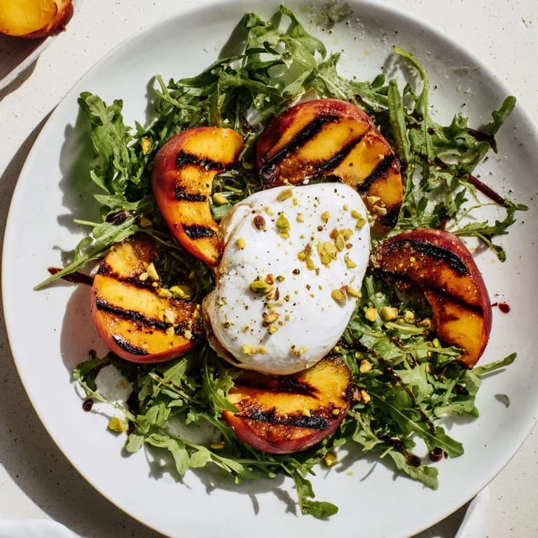 Save to Pinterest One August afternoon, I was standing at the farmers market with no dinner plan when a vendor handed me a peach to smell. That fragrance—honey-sweet and almost floral—made the choice for me. I grabbed six of them without thinking twice. Back home, I realized I had arugula wilting in the fridge and a ball of burrata I'd been saving. Grilling the peaches felt like a natural impulse, and the moment they hit the hot grates, caramelizing at the edges, I knew I was onto something special.