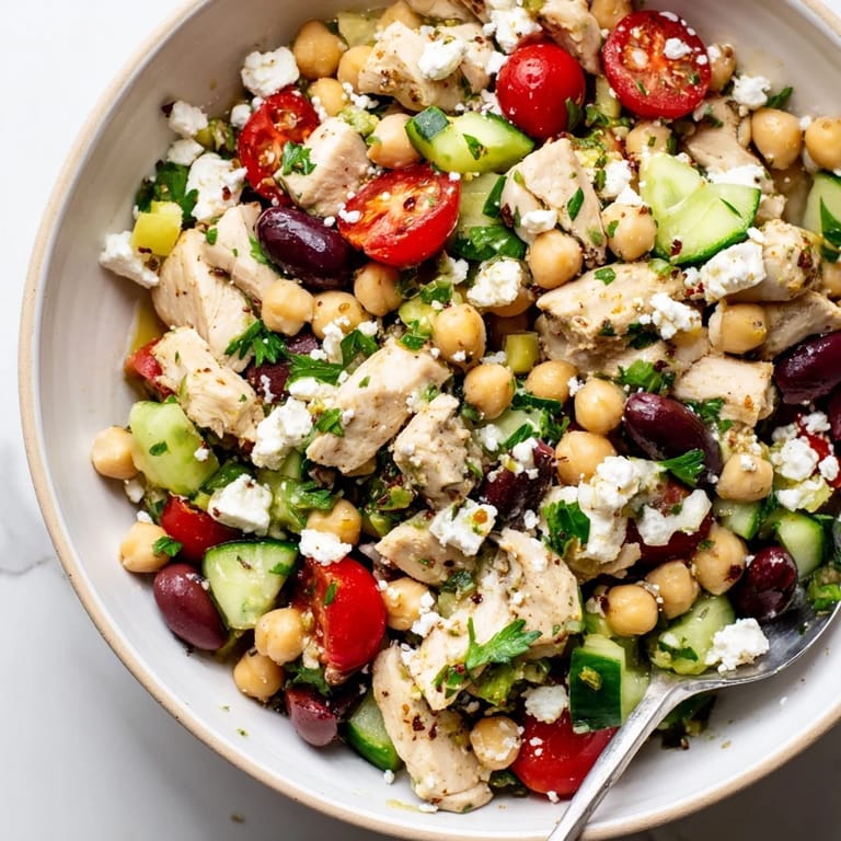 Save to Pinterest The air in my tiny apartment kitchen was thick with humidity that July afternoon, my ancient window unit struggling against the heat. I had just returned from the farmers market with a bag bursting with cherry tomatoes and cucumber, plus a rotisserie chicken from the grocery store down the street. Something about the way the sunlight hit those tomatoes made me crave the bright, punchy flavors I'd encountered in a little Greek restaurant years before. This salad came together in that glorious space between laziness and inspiration, when you want something substantial but refuse to turn on the stove.