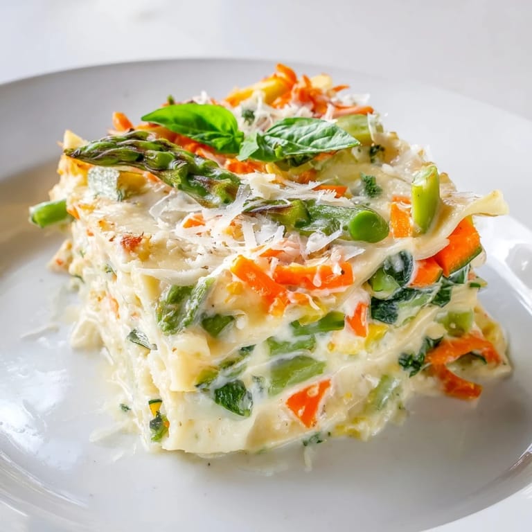 Save to Pinterest The first time I made this lasagna, it was actually on accident. I had planned to make a traditional vegetable lasagna but realized halfway through prep that I was completely out of marinara sauce. The only thing in my refrigerator was a jar of light Alfredo sauce from a pasta dinner earlier in the week, and honestly, I was ready to order takeout instead of improvising.