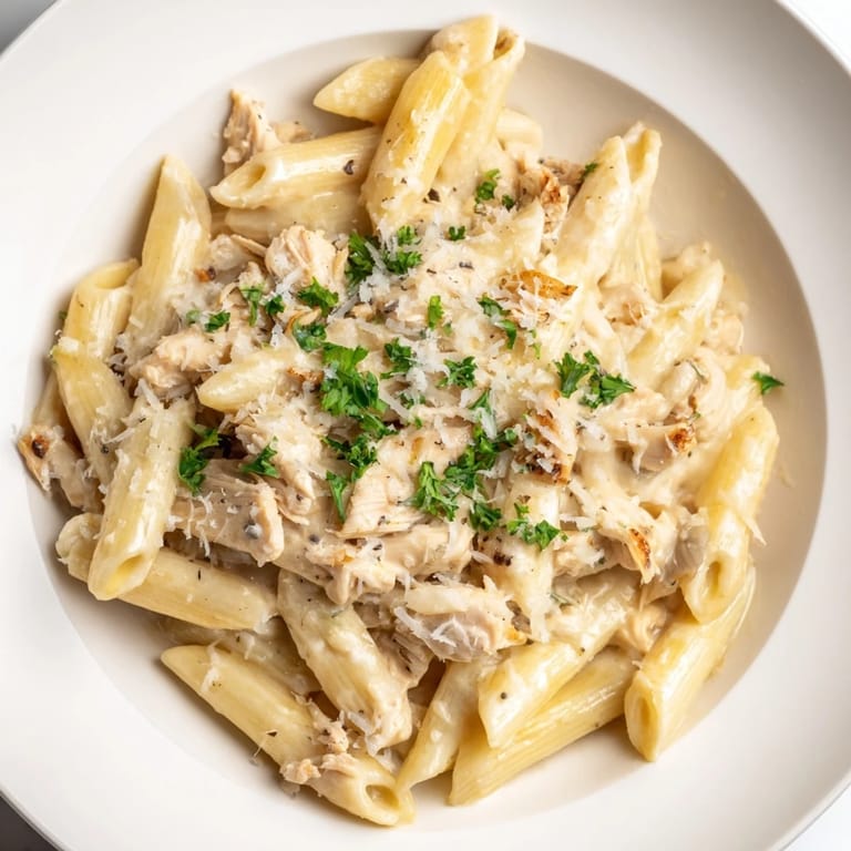 Save to Pinterest There's something about a weeknight when the kitchen smells like garlic and cream that just feels like home. I discovered this creamy chicken pasta completely by accident—I had leftover rotisserie chicken, a craving for something indulgent, and about thirty minutes before dinner needed to happen. What started as improvisation became the dish I make whenever I want comfort without the fuss, or when friends drop by and I want them to feel genuinely welcomed at my table.